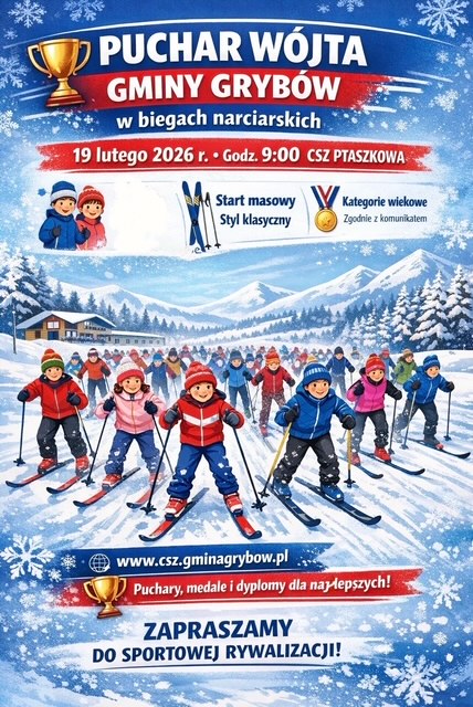 19 lutego na obiektach CSZ Ptaszkowa odbędą się zawody w biegach narciarskich o Puchar Wójta Gminy Grybów Jacek Migacz - Wójt Gminy Grybów. Zainteresowane osoby prosimy o kontakt z nauczycielami wychowania fizycznego. Szczegóły w regulaminie.