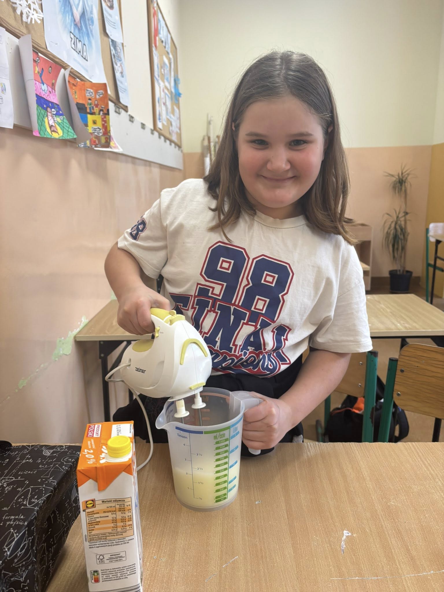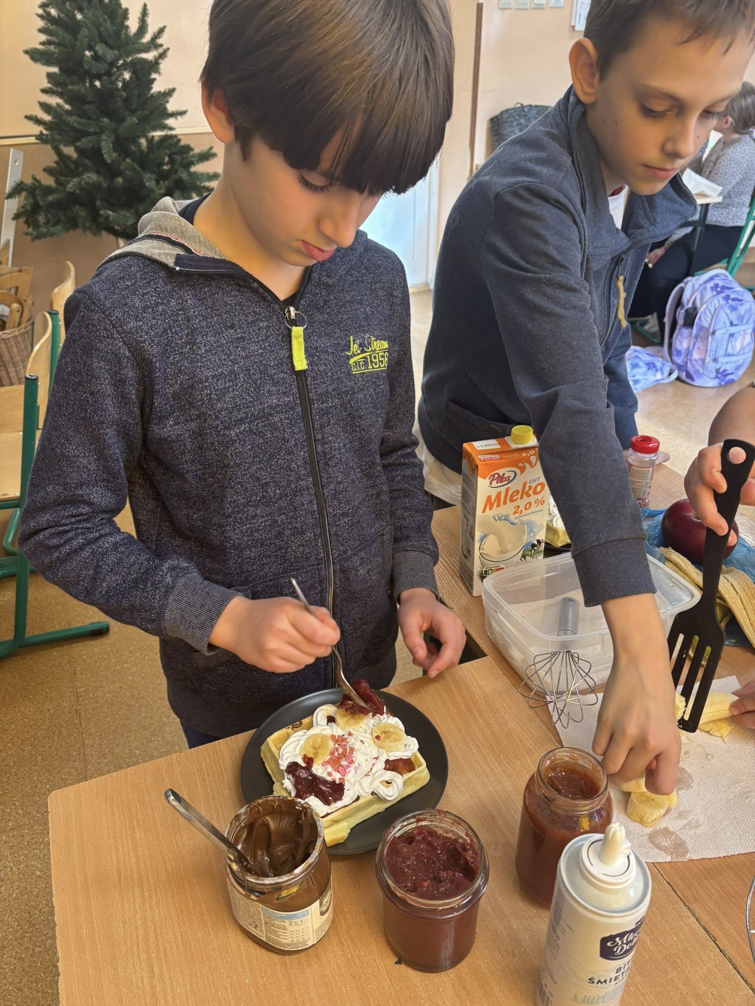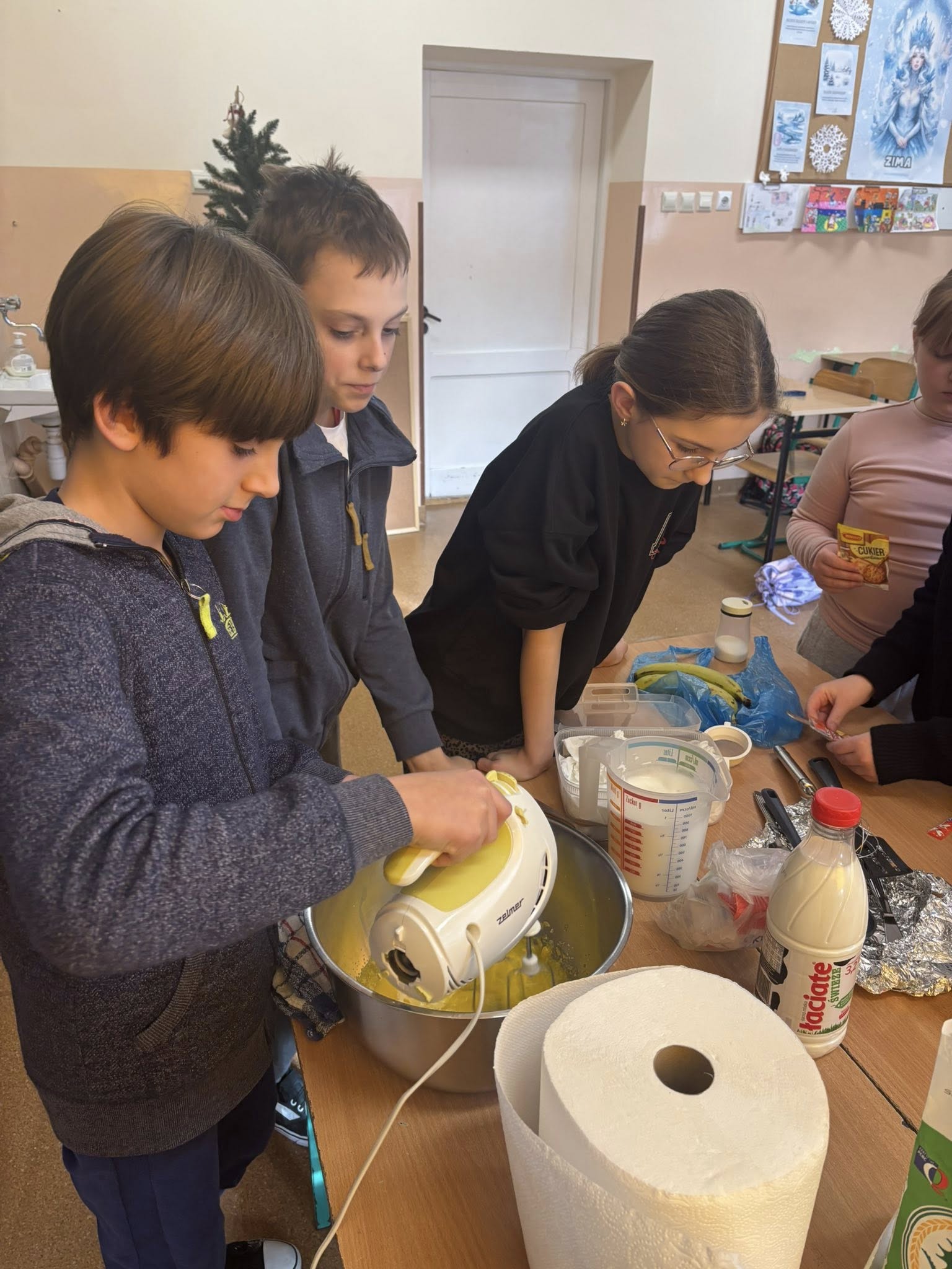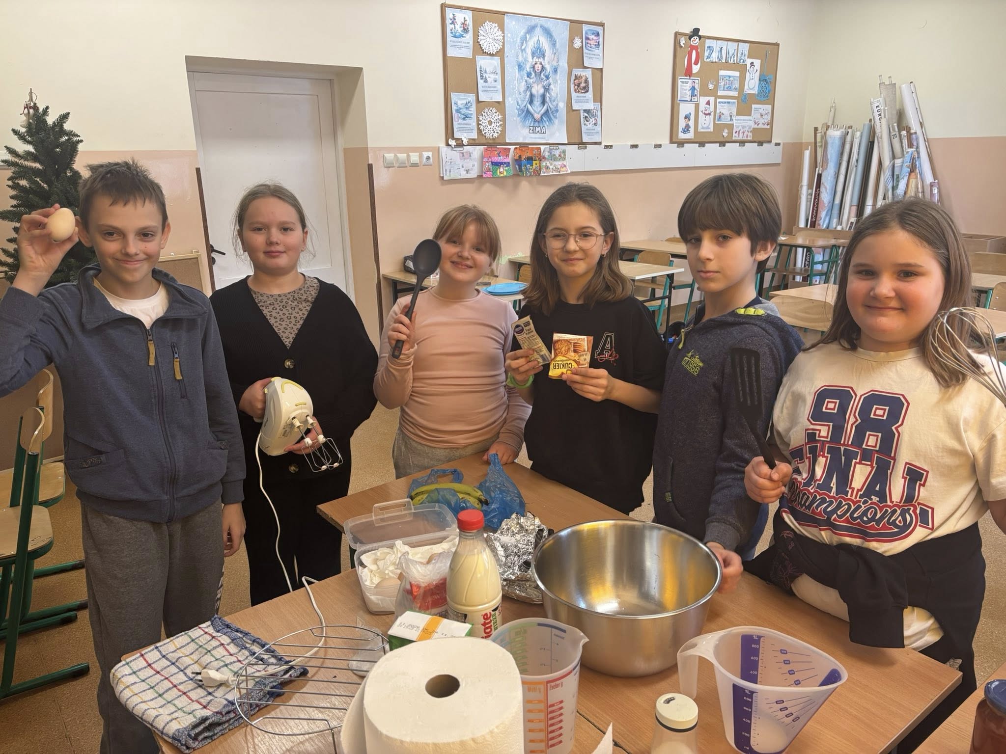 Na zajęciach dodatkowych uczniowie przygotowywali gofry. Podczas zajęć dzieci uczyły się ważyć produkty w kilogramach oraz odmierzać płyny w litrach, wykorzystując miarki kuchenne i wagę. Uczniowie z zaangażowaniem brali udział w całym procesie – od przygotowania składników po pieczenie gofrów.
