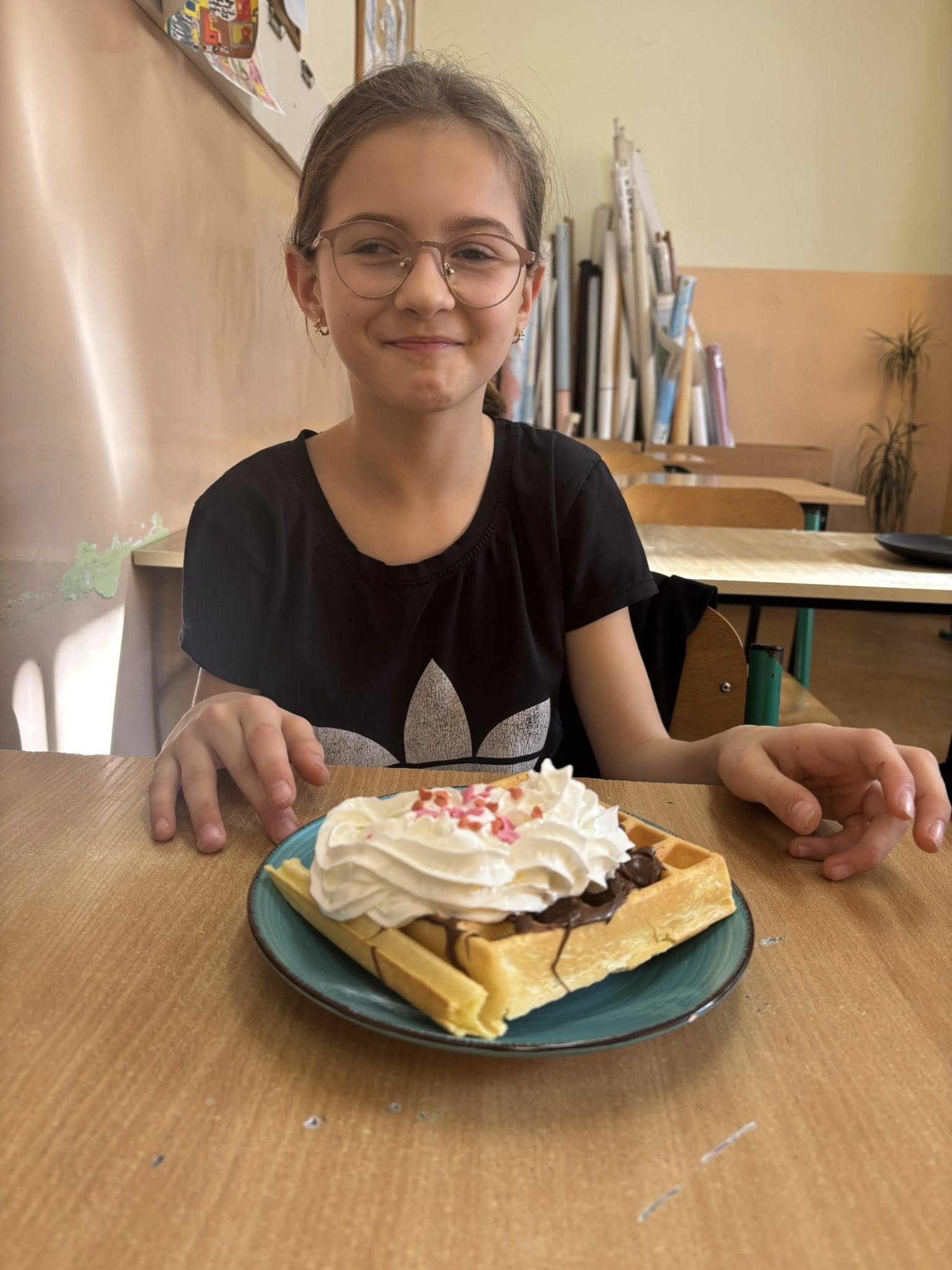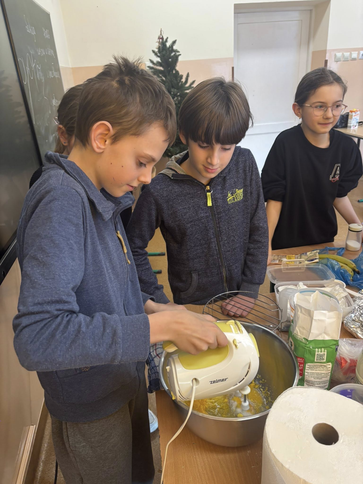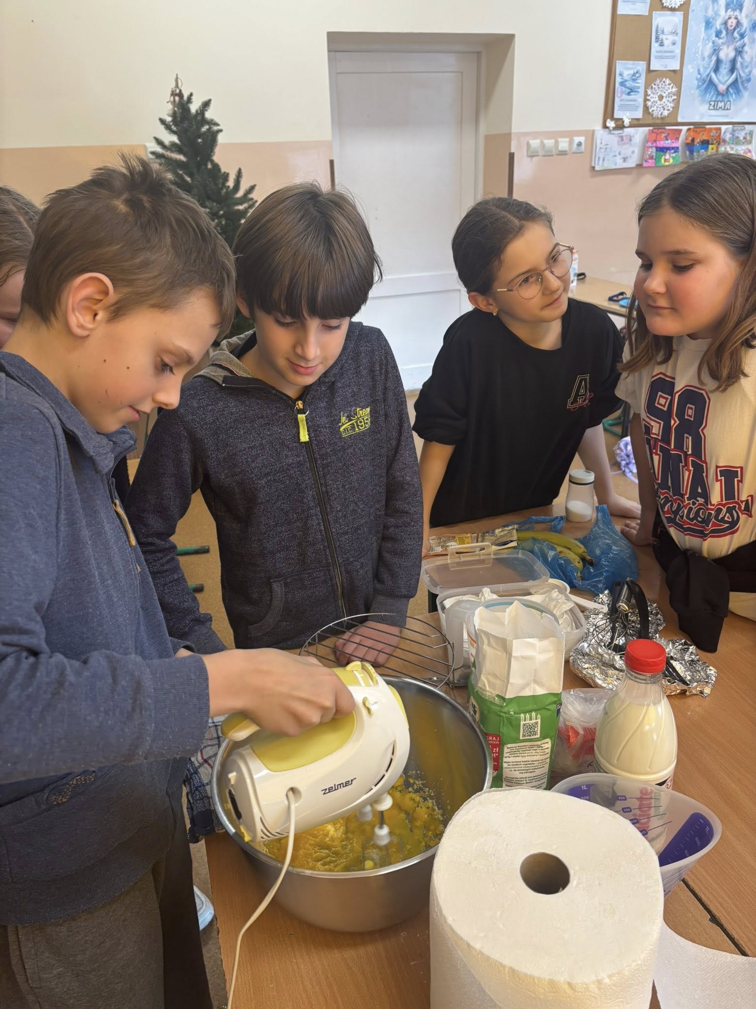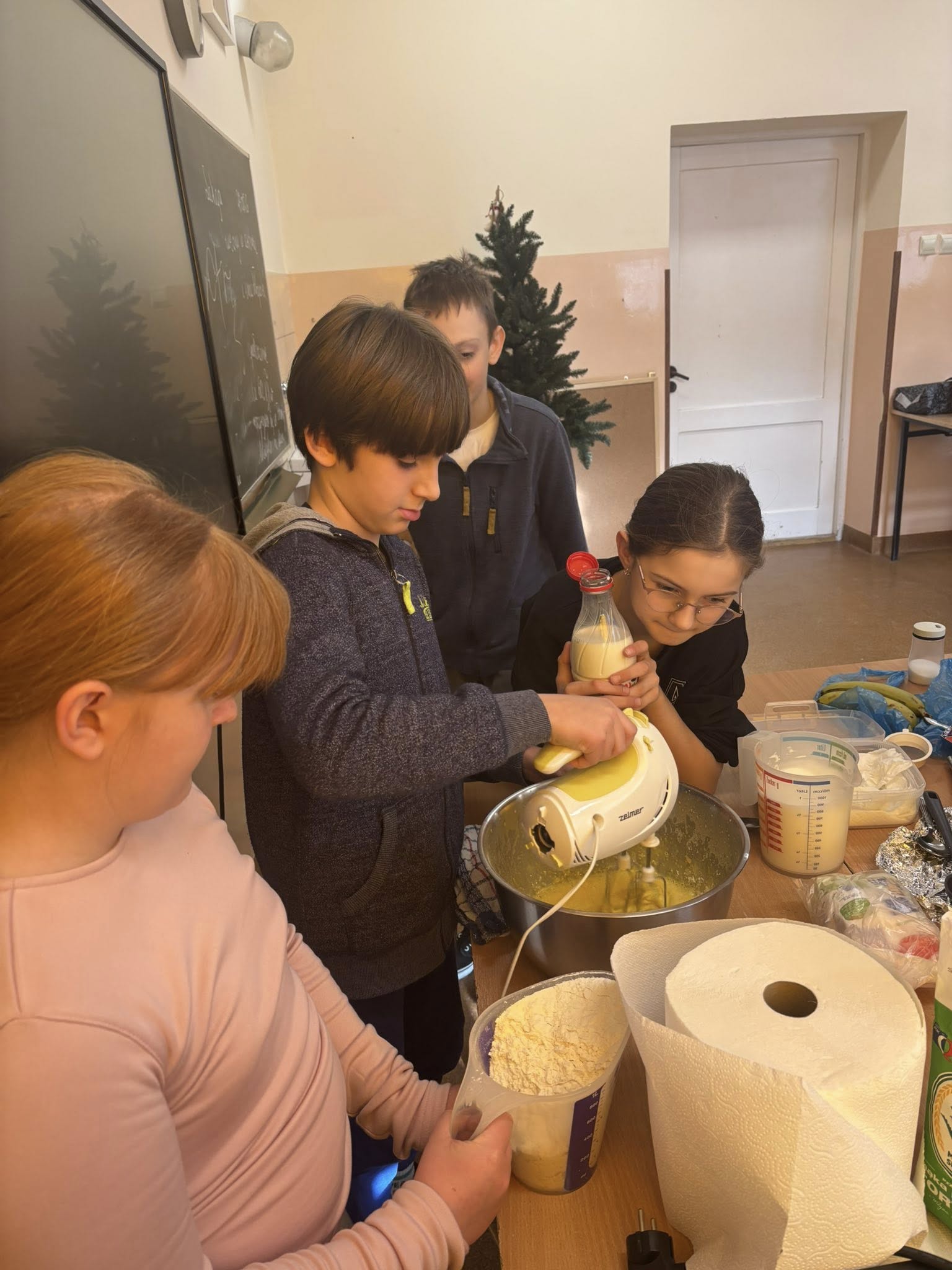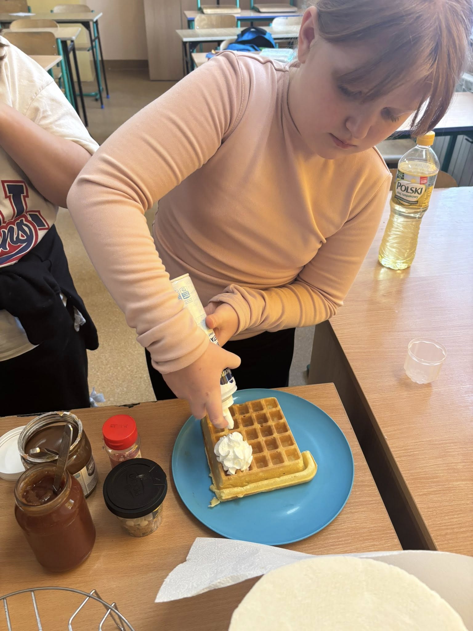 Na zajęciach dodatkowych uczniowie przygotowywali gofry. Podczas zajęć dzieci uczyły się ważyć produkty w kilogramach oraz odmierzać płyny w litrach, wykorzystując miarki kuchenne i wagę. Uczniowie z zaangażowaniem brali udział w całym procesie – od przygotowania składników po pieczenie gofrów.
